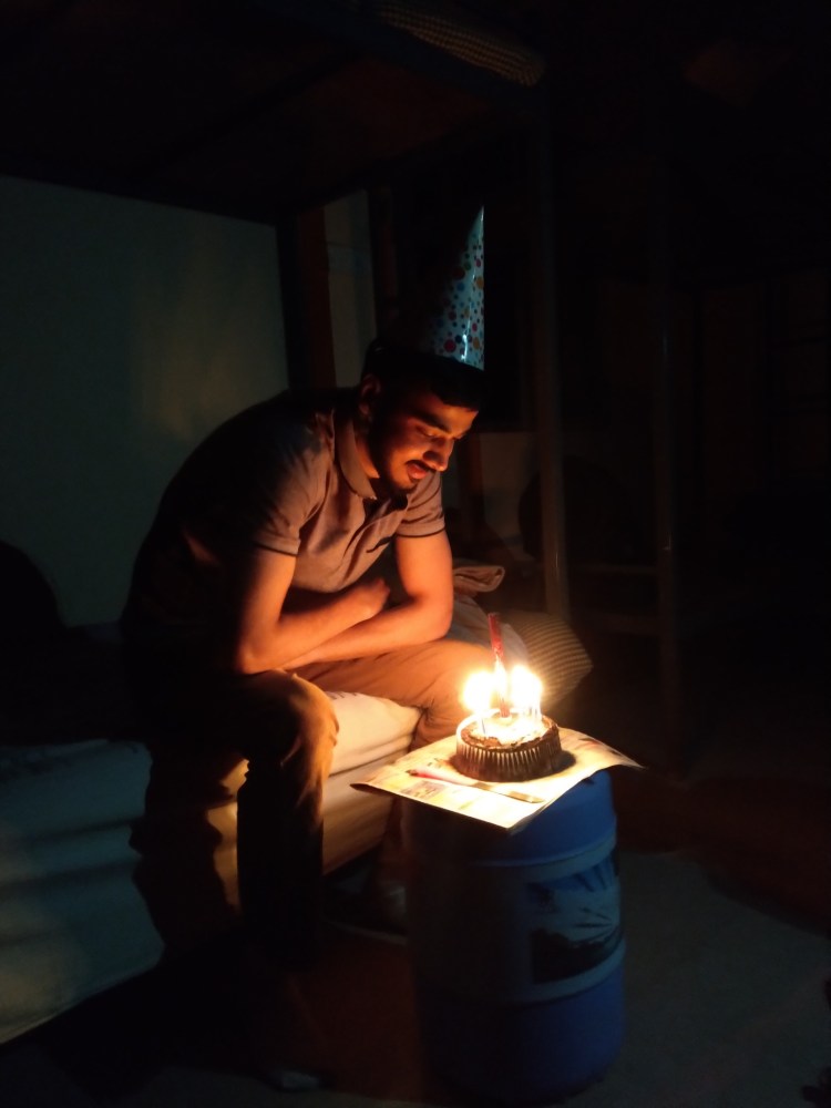 When we returned inside the dormitory, Sushil uncle and Muffaddal dada had woken up and gone outside. While we were playing cards, someone brought a cake because it was Muffaddal dada’s birthday. Just then, he came in and got a surprise, and we ate cake.