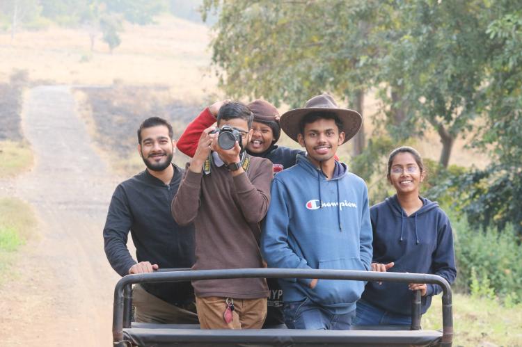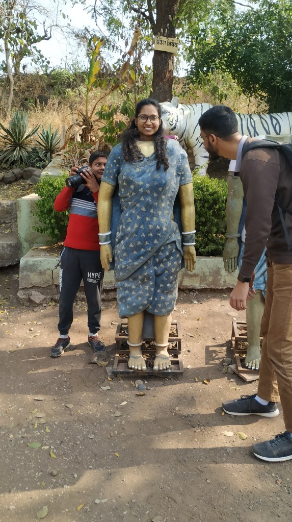 From sunrise, I had eaten a packet of chips and a little bit of chiwda (spicy mixture) from one box. At one point, the guide told us that the buffer zone had ended and the core zone had begun. After a long time, we all stopped at a resting spot. Both jeeps stopped there. The guide said we could get down. We got down with our bags. Outside the gate of that rest stop, there was a tree planted in a tire filled with mud. That seemed new to me because I had only seen such things in a bamboo garden which is present in Amravati, nowhere else. After going inside, we sat down. Everyone except me ate poha. I saw a man go near a dog, and the dog tried to fold its hands as if greeting the man. I thought maybe that dog greets everyone, so I went to the dog, but it didn’t greet me at all and didn’t show any reaction either. I went back and forth near the dog many times, but it never reacted.
