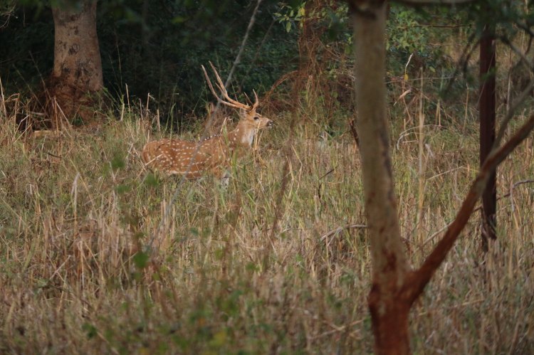 I took some photos using Sushil uncle’s camera. Just then, our guide told us that we would have to leave soon because “calling” had started. I was puzzled — what is “calling”? Later I found out that “calling” means one animal is warning others that a tiger or leopard has arrived. Some distance away from us, one animal was making a “hawk-hawk” sound. That sound was very sharp. Just then, I heard a tiger’s roar. I told them I heard the sound in that direction, so we drove the vehicle in that direction. We went up to that place. But even where we had stopped, there was nothing. After that, I never heard that sound again. Then we went forward and stopped, thinking that the tiger might have gone ahead to hunt, but there was nothing there either. We kept moving forward and stayed alert. I would sometimes stand up in the jeep and sit down when tired. When the jeep passed through lush green forest, I would sit down because I was scared — most animals live in dense forest, and monkeys live in trees. They might jump onto the jeep or someone’s body. But when the path was dry with dry leaves and where sunlight was falling, I would stand up confidently. After some time, we saw a large group of deer in a field. They looked very small to me because they were far away. I was completely focused on looking outside — even when I stood up or sat down due to tiredness, I kept looking. Only when I bumped into something I would realize I was sitting. Suddenly Kumail dada said, “Stop the jeep”, so the driver stopped and reversed slightly. There was an animal with an orange color and some white round spots on its body. It was a deer. I think it stood there for only two seconds, and in that time, Muffaddal dada couldn’t even take a photo. During those two seconds, the deer had turned its face toward us, but then it ran away. Only photos of it running were captured. The guide told us that the deer was called Chousingha, because it had four horns. I hadn’t paid enough attention to its horns, so I didn’t see them properly.