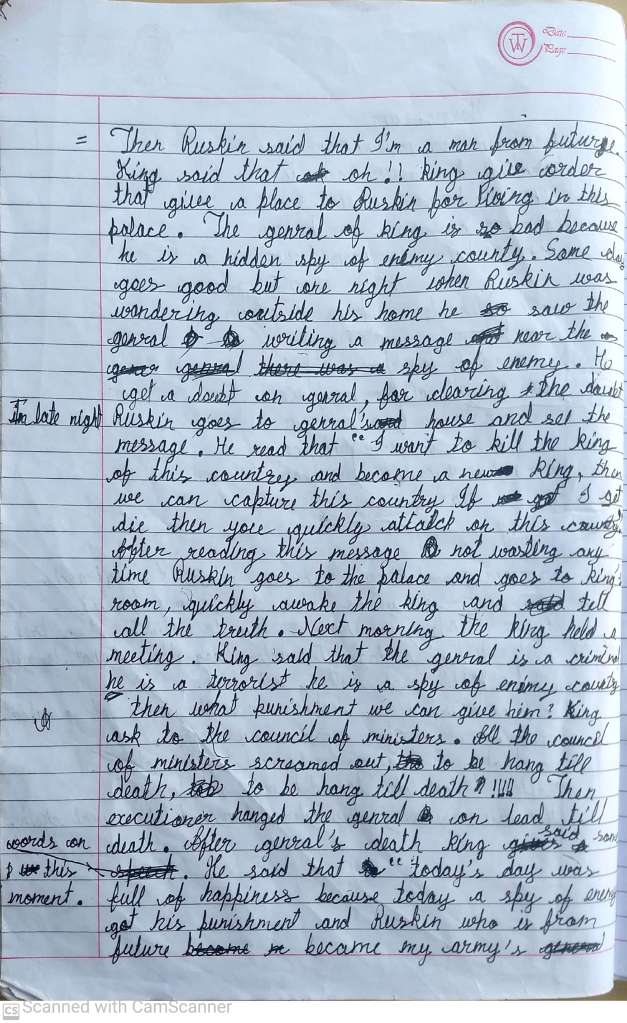 The council of ministers get shocked seeing Ruskin flying. The king, who is a very kind king, gets very shocked and asks, “Who are you ? Then Ruskin said that I am a man from the future. King said Oh !! King gave an order to give a place to Ruskin for living in the palace. The military general of the king is so bad because he is a spy of an enemy country. Some days went well but one night when Ruskin was wandering outside of his home he saw the military general writing a message. He gets a doubt on the military general, for clearing the doubt in late night Ruskin goes to the military general’s house and sees the message. He read that “ I want to kill the king of this country and become a new king, then we can capture this country. If I die then you will quickly attack this country”. After reading this message not wasting any time Ruskin goes to the palace and goes to the king’s room, quickly awakens the king and tells all the truth. Next morning the king held a meeting.