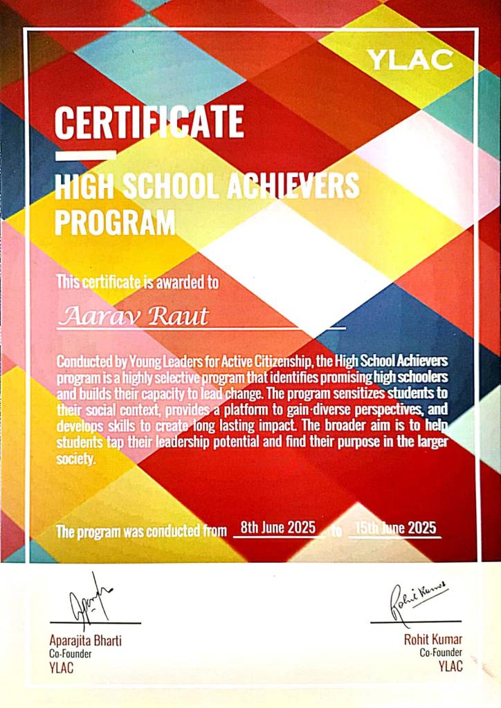 This reflective narrative recounts my deeply transformative experience participating in the Young Leaders for Active Citizenship (YLAC) High School Achievers Program, held over eight days from June 8 to June 15, 2025, in Hauz Khas, New Delhi. The program introduced me to a range of topics that shape our society — including democracy, public policy, identity and privilege, social justice, disability inclusion, advocacy, economic systems, and leadership. Through a mix of group discussions, role plays, guest lectures, simulations, and field visits (including one to AADI – Action for Ability Development and Inclusion), the program gave me new ways to think about the world and my place in it.